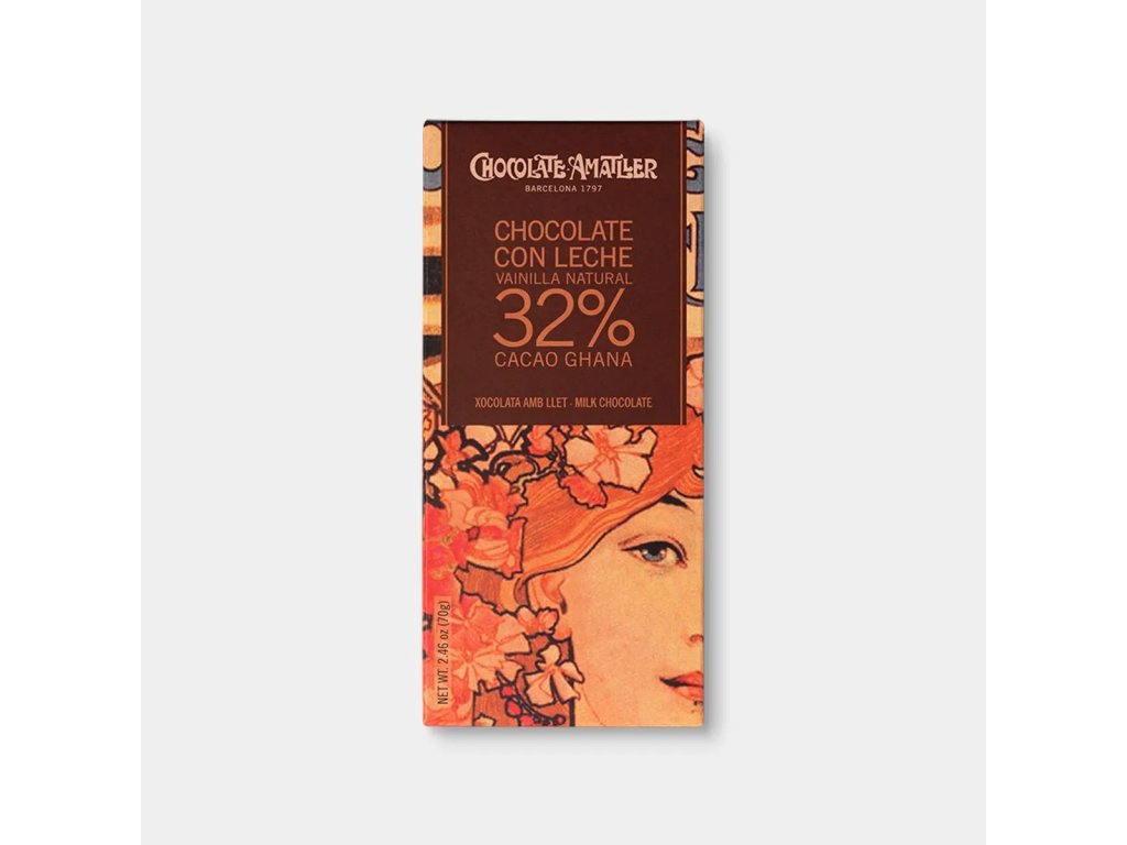 Výjimečná single origin čokoláda z edice Cacao Origen s obalem, který pro španělskou čokoládovnu Amatller navrhl Alfons Mucha. Mléčná čokoláda se 32 % kakaa z Ghany s vanilkou z Réunionu vás okouzlí krémovou harmonickou chutí.