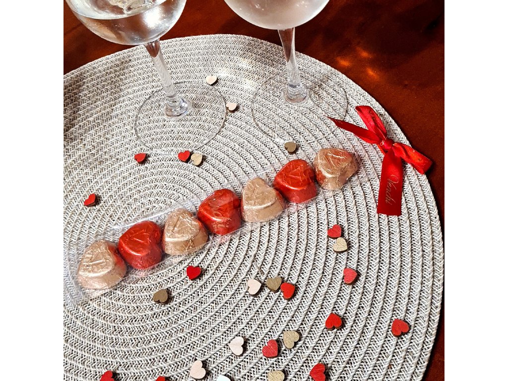 Dopřejte si výjimečný chuťový zážitek s naším exkluzivním balením Srdíčková harmonie – Červená mašle. Osm nádherných čokoládových srdíček ve dvou elegantních barvách – čtyři smyslně červené a čtyři zářivě zlaté – je dokonalým dárkem pro každého milovníka luxusní čokolády. Zabalené v půvabném blistru a ozdobené červenou mašlí, jsou symbolem lásky, radosti a sladkého pokušení. Dopřejte sobě nebo svým blízkým nezapomenutelný okamžik plný chutí a elegance! 🍫❤️🎀 (Balení obsahuje 7 srdíček 3x červené a 4x zlaté)