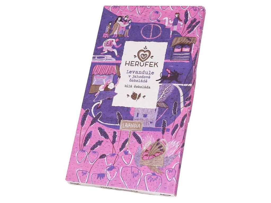 Herůfek čokoláda bílá 48% s jahodami a levandulí 50g