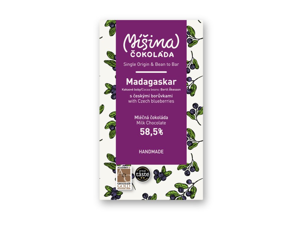 Mléčná čokoláda z organických kakaových bobů z Madagaskaru s borůvkami z českých lesů.