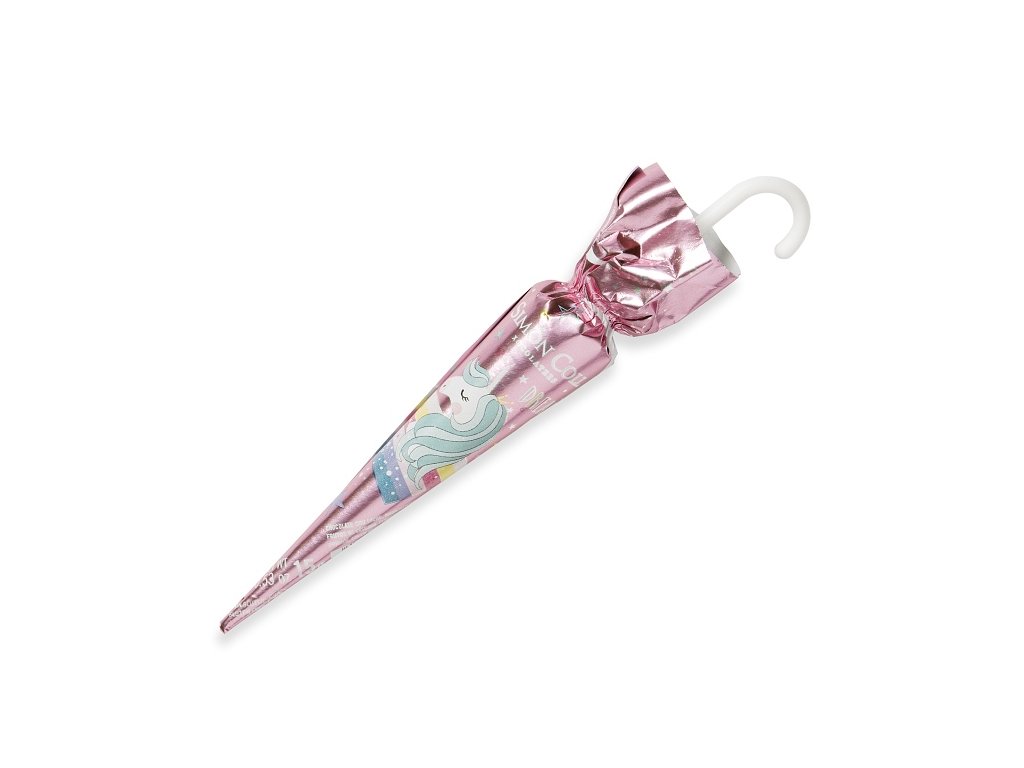 Děti budou tento deštníček milovat. Deštníček posetý kouzelnými jednorožci, skrývá uvnitř na tyčce lahodnou mléčnou čokoládu s 32 % kakaa.