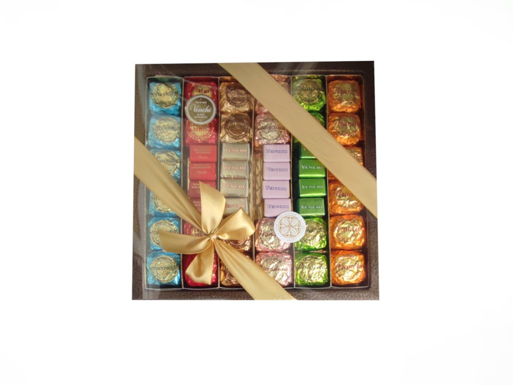 Krabička je uzavřena průhledným plastovým víčkem a převázána luxusní stuhou se zlatým puncem značky Venchi.