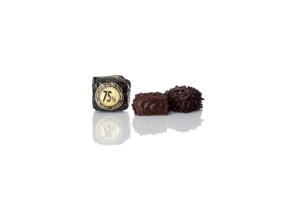 Extra tmavá čokoláda s bohatou kakaovou náplní. V srdci této pralinky bije srdce z výběrového kakaa a nejkvalitnějšího olivového oleje. Náplň zahaluje vrstva tmavé čokolády 75% cocoa a vrstva čokolády 56% cocoa. Korunováno perličkami z hořké čokolády 75% cocoa.