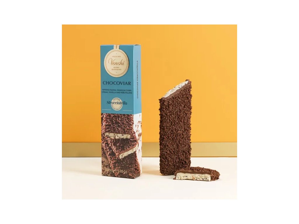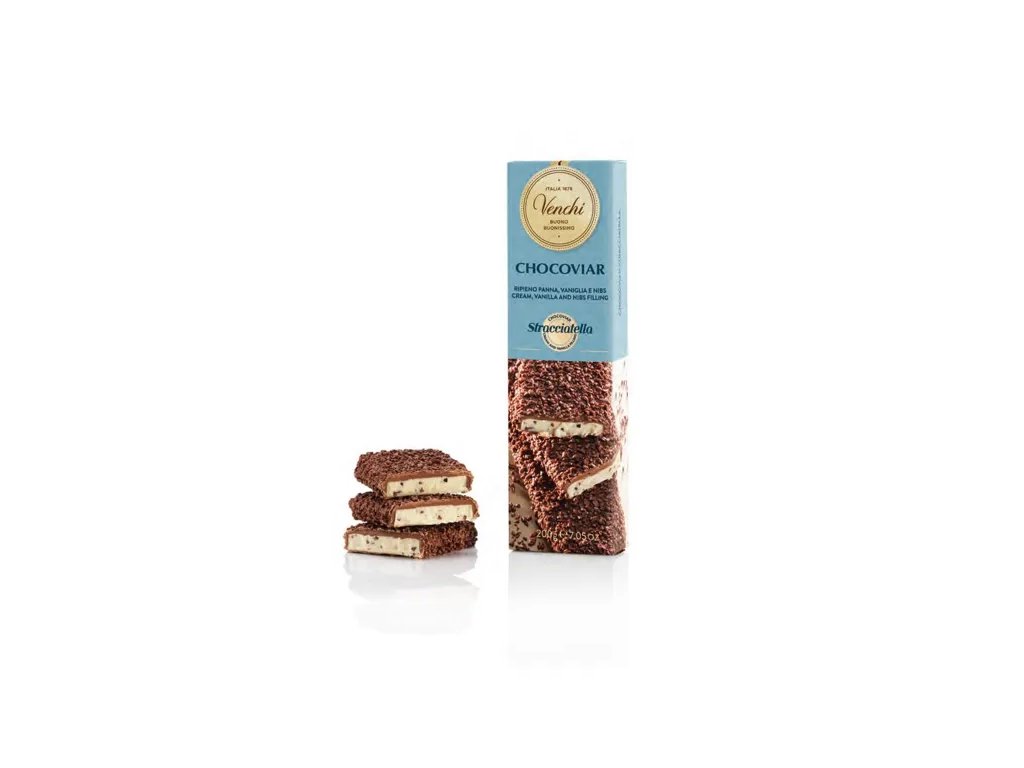 Venchi Chocoviar Stracciatella mekká tyčink představuje luxusní čokoládovou tyčinku od slavné italské značky Venchi. Každý kus je velkoryse naplněn krémovou směsí ze smetany, vanilky a křupavých kakaových bobů, které dohromady vytvářejí charakteristickou stracciatella chuť. Tato náplň je obalena mléčnou čokoládou s mikro perlami Chocoviar, které dodávají texturu a intenzivní kakaový prožitek. Tyčinka je bez lepku a vyrobena z kvalitních surovin jako cukr, kakaové máslo, mléčné složky, kakaová hmota a přírodní vanilka. Výsledkem je sladká a krémová čokoládová pochoutka vhodná jak pro osobní požitek, tak jako dárek.