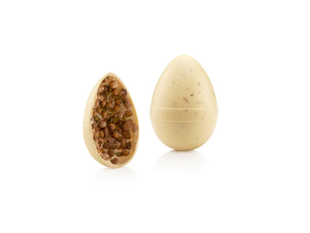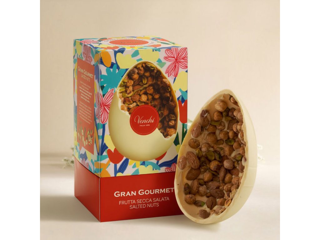 Venchi velikonoční gurmen vejce bílá čokoláda mix oříšků 500 g představuje kombinaci bohaté, krémové bílé čokolády s praženými a lehce slanými ořechy – mandlemi, piemontskými lískovými oříšky a pistáciemi. Tato i ta varianta vytváří perfektní rovnováhu mezi sladkou a jemně slanou chutí, která potěší i ty nejnáročnější milovníky čokolády.